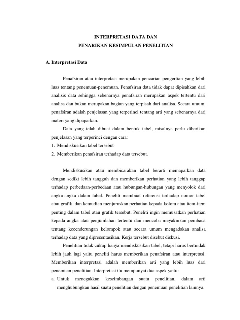 Memberikan interpretasi adalah memberikan arti yang lebih luas dari penemuan penelitian. Tujuan dari interprestasi data untuk menjawab 4 pertanyaan yaitu: .interpretasi data, perencanaan baru, tindakan dan pengumpulan data, analisis dan interpretasi b. Analisis data dan interpretasi hasil penelitian | ii. Sehingga untuk melakukan eksporasi perlu suatu konsep eksploari yang tepat dan.